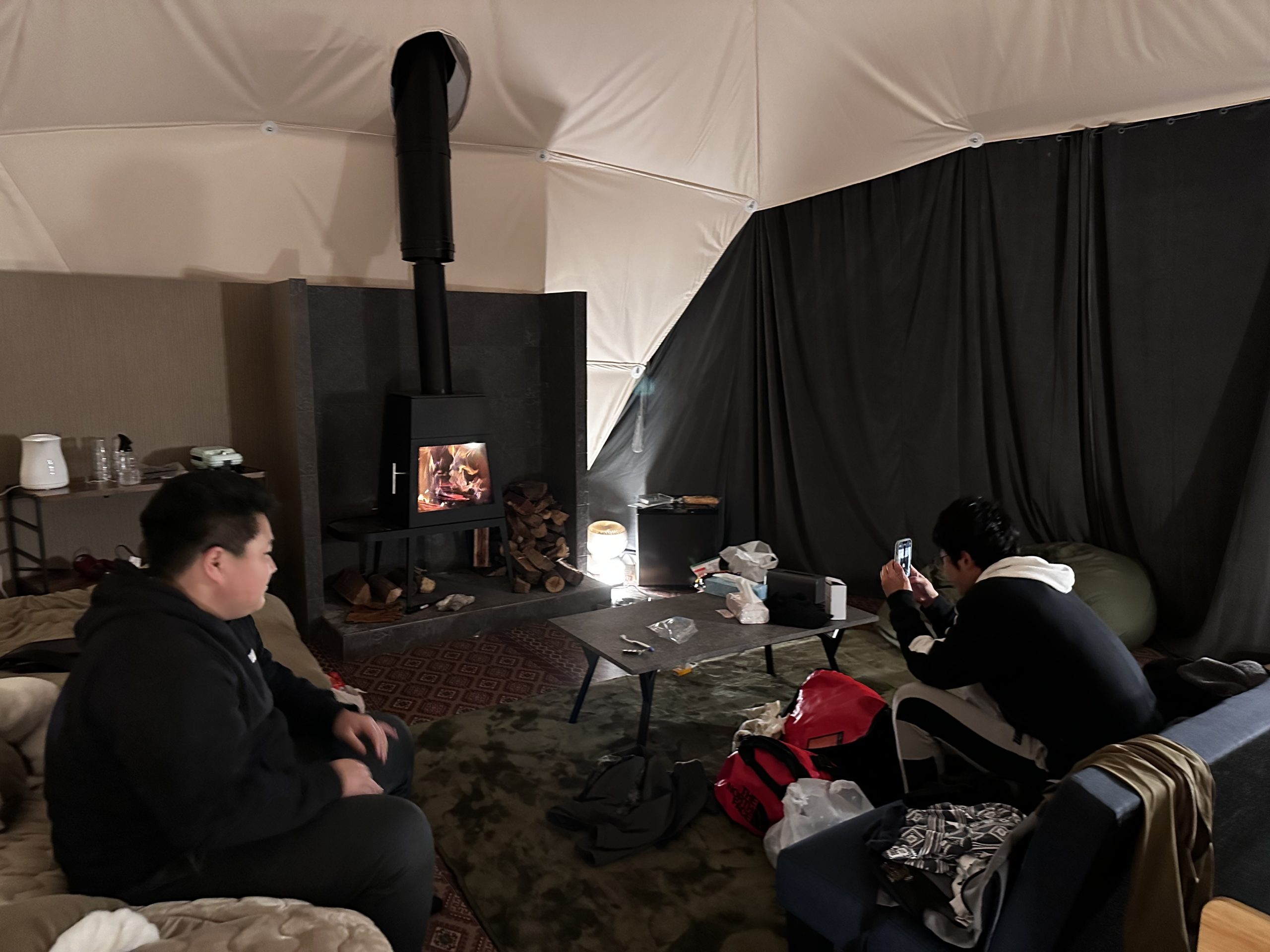 まだまだ雪が残り外は寒さが有るものの、グランピング内ではエアコン、ファンヒーター、薪ストーブが有り、寒さ対策は万全なので-10度になっても全く問題なく楽しむことが出来ます。